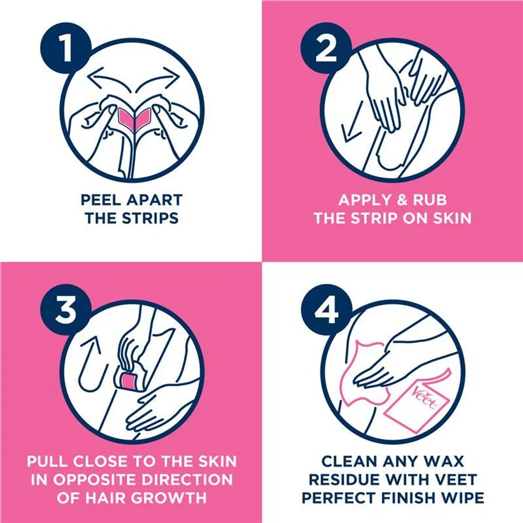 在使用 Veet Wax Strips 之前,請仔細閱讀包裝注意事項。在打蠟之前確保皮膚完全清潔和乾燥,您可以重複使用每條條帶一次,直到它失去粘性。